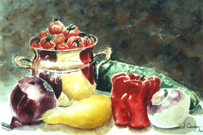 Brass Pot with Vegetables $200 15 in X 11 in Watercolor Sold