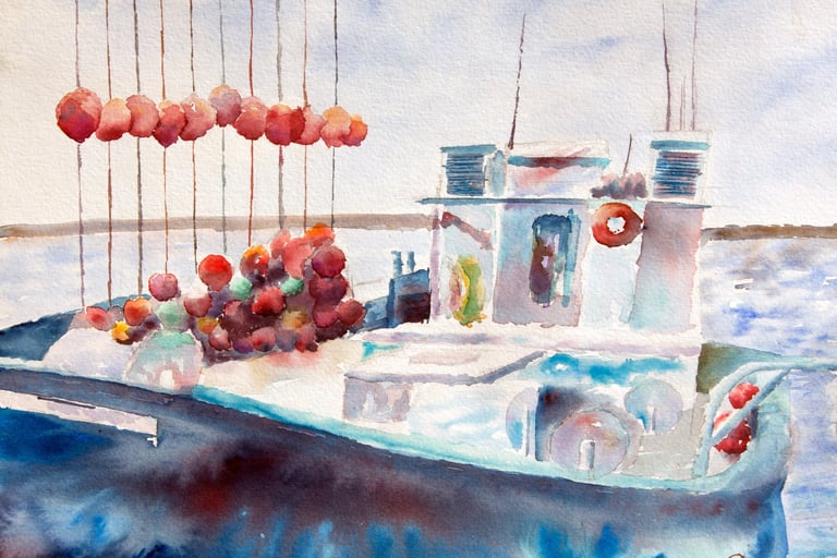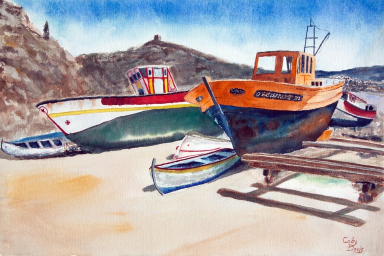 European Fishing Boats $250 30 in X 22 in Watercolor Unframed